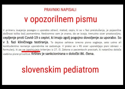 EU-SEARCH NOVICE | Civilna iniciativa slovenskih pravnikov: OPOZORILNO PISMO SLOVENSKIM PEDIATROM ...Civilna iniciativa slovenskih pravnikov: OPOZORILNO PISMO SLOVENSKIM PEDIATROM (04.07.2021) | newsexchange ... "Otroške zdravnike poskušamo ozavestiti, da za posledice cepljenja kazensko odgovarjajo. Žal številni zdravniki menijo, da je glavna odgovornost na njihovih predpostavljenih, pa temu ni tako. Za neželene ... | Podobno