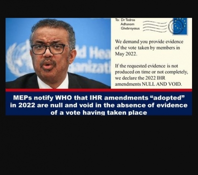 Poslanci Evropskega parlamenta od WHO zahtevajo dokaz o spremembi IHR, ki so »sprejete« leta 2022, ker ni dokazov, da je bilo glasovanje opravljeno so nične in neveljavne (30.11.2023) | newsexchange ... 12 poslancev Evropskega parlamenta (»poslanci«) je pisalo Svetovni zdravstveni organizaciji in zahtevalo »prepričljive in nedvoumne dokaze«, da so bile spremembe mednarodnih zdravstvenih predpisov ... | Podobno