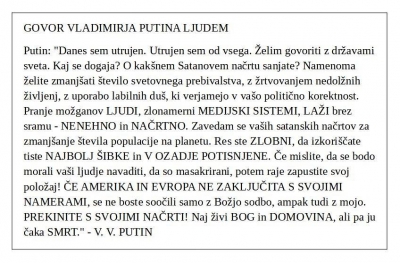 Sporočilo ruskega predsednika Vladimirja Putina vsem narodom sveta (04.08.2022) | newsexchange ... "Dragi državljani našega čudovitega planeta Zemlje! Jaz, predsednik Ruske federacije Vladimir Putin, sem se odločil, da se obrnem neposredno na vse vas, mimo vaših diplomatov, oblastnikov ... | Podobno