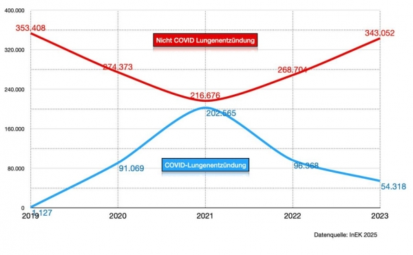 Poznati analitičar podataka Tom Lausen nedavno je na Telegramu istaknuo da je došlo do očitog “prekodiranja” upale pluća u godinama Corone: 2021. “virusna upala pluća” (ICD J12.8) eksplodirala je u njemačkim klinikama, dok je upala pluća u drugim podrijetlima zabilježena mnogo rjeđe. Je li SARS-CoV-2 brzo iskorijenio druge uzroke bolesti? Jedva. Umjesto toga, podaci podsjećaju na naglo “odumiranje” gripe, koja je odjednom samo nazvana Covid-19.