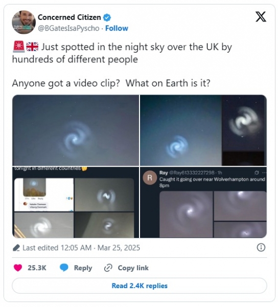 Tajanstveni prizor zaprepastio je milijune, potaknuvši nagađanja o vanzemaljcima ili drugim fenomenima; međutim, meteorološki ured Ujedinjenog Kraljevstva (Met Office) kasnije je objasnio da je to vjerojatno zbog lansiranja SpaceX rakete ranije tog dana, što je u krajnjem slučaju smješno.