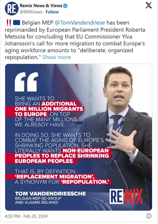 Bruxellesski eurokrati, međutim, ostaju vjerni svojoj liniji: migracije, sve više migracija, migracije kao pitanje nacionalnog interesa. Povjerenica Ylva Johansson otvoreno fantazira o milijun migranata godišnje kako bi “popravila” europsko tržište rada. Filip Dewinter i njegov stranački kolega Tom Vandendriessche ispravno tumače ovu poruku: politika repopulacije – ciljano preseljenje jer domaće stanovništvo više ne rađa djecu.