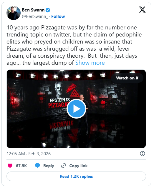 Swann to otvoreno kaže: „Epstein je Pizzagate.“ Referira se na 2016. godinu, kada je Pizzagate postao jedna od najrazmatranijih tema na društvenim mrežama. U to vrijeme tvrdilo se da su utjecajne političke i društvene osobe dio organiziranih mreža zlostavljanja.
