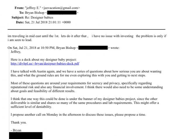„Dizajnerske bebe“ U julu 2018. godine, „transhumanista“ Brajan Bišop kontaktirao je Epstajna tražeći finansiranje projekta „dizajnerskih beba“. Inspirisan kineskim eksperimentima sa genetski modifikovanom decom, Bišop je Epstajnu poslao plan projekta i tražio novac. Epstajn je pristao, uz jedan uslov – potpuna tajnost.