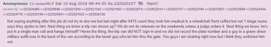 Tvrdnja se prvi put anonimno pojavila na internetu u ranim jutarnjim satima 10. avgusta 2019. godine, a objavio ju je čovek koji se predstavio kao zaposleni u Metropoliten popravnom centru na Menhetnu.