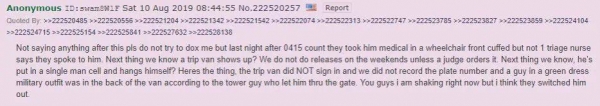 Ob tvrdi da je Epštajn živ iznet iz zatvora, vezan u invalidskim kolicima, i odvezen neovlašćenim vozilom koje nije prošlo standardnu proceduru evidentiranja.