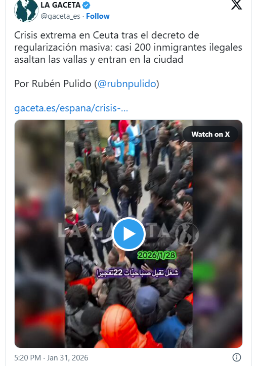 Druga reakcija je trenutni napad na granice, jer je možda polovica Afrike sada krenula prema Španjolskoj. Oni koji su već bili blizu (u Maroku) prešli su granicu posljednjih dana i trenutno čekaju prebacivanje iz Ceute u migracijske centre diljem Španjolske.