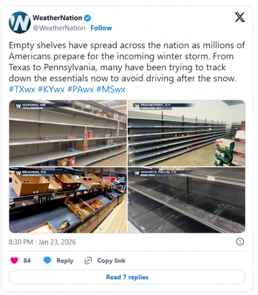 Empty shelves have spread across the nation as millions of Americans prepare for the incoming winter storm. From Texas to Pennsylvania, many have been trying to track down the essentials now to avoid driving after the snow.