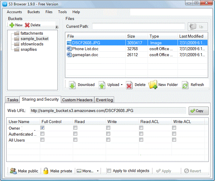 S3 Browser is a free client interface for users of the Amazon S3 and CloudFront service. It provides an easy to use GUI to manage your storage buckets and allows you to upload and download files.