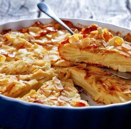 Pečico segrejemo na 190°C. Pekač premera 22 cm namažemo z maslom in poprašimo z moko. Vanj vlijemo zmes z jabolki in poravnamo s kuhalnico. Pečemo 30 minut, potresemo še z mandljevimi lističi in vrnemo v pečico še za 10 minut.