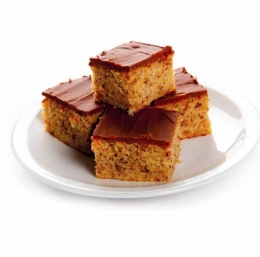 Medtem pripravi čokoladni obliv. Čokolado razlomi v lonček, jo počasi segrej, da se stopi, in vmešaj še maslo. Ko je kolač pečen, ga previdno vzemi iz pečice in prelij s stopljeno čokolado. Kolač naj se ohladi, nato ga razreži na kocke.