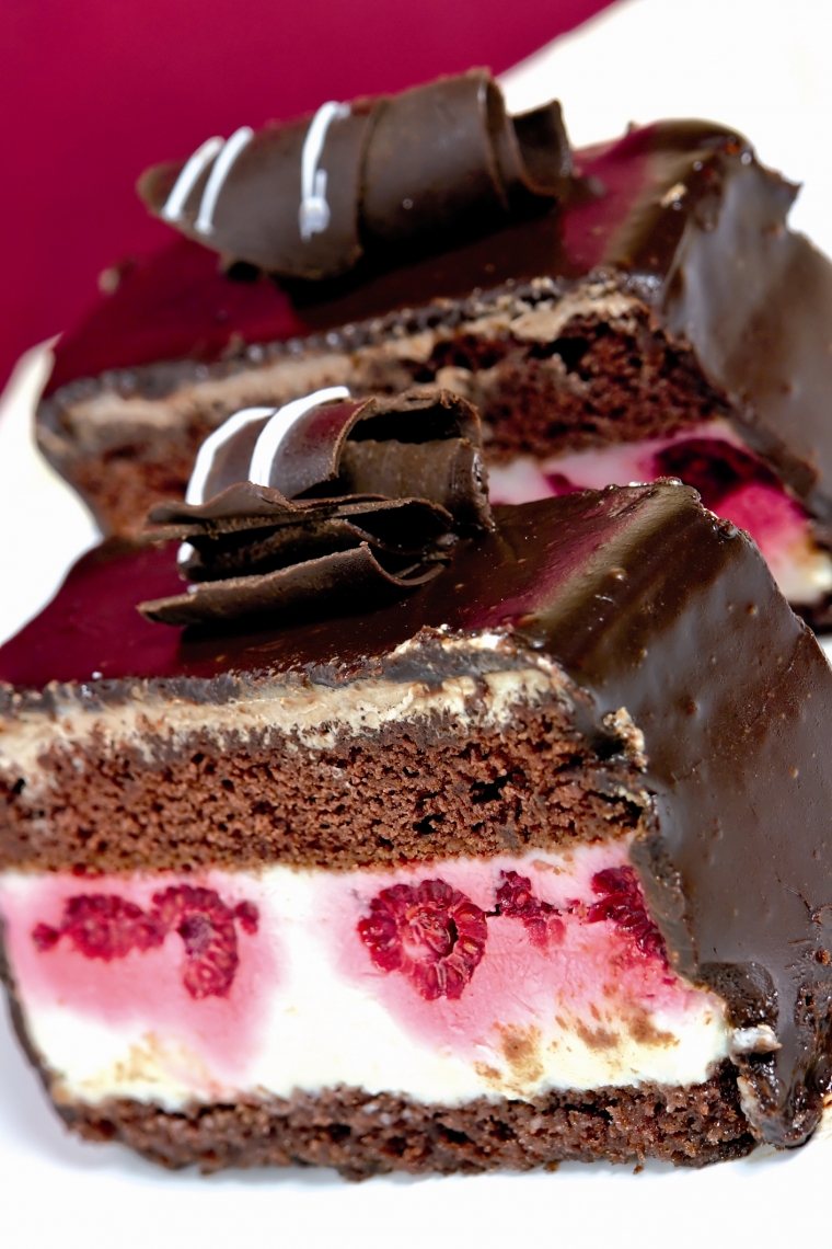 Čokolado nalomimo na koščke, damo v posodico in stopimo nad soparo. Sladico oblijemo s stopljeno čokolado. Ko se čokolada strdi, sladico narežemo ter rezine okrasimo z ostružki čokolade in malinami.