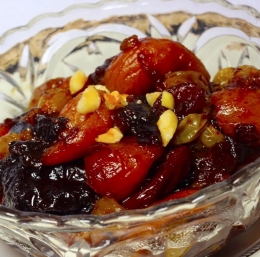 Potem namočeno sadje odcedimo in ga v skledi zmešamo z oreški, dodamo še kardamom, cimet, sirup in rožno vodo. Premešamo in mešanico znova damo v hladilnik za uro ali dve.