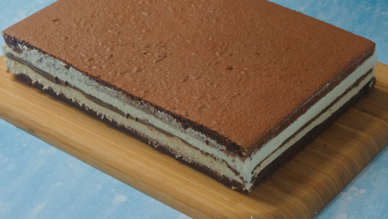 Pečen biskvit pustimo hladiti do 20 minut, nato pa ga prerežemo na pol, tako da dobimo dva manjša pravokotnika.