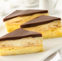 Banane olupimo, razpolovimo in narežemo na tanke rezine. Banane položimo na biskvit (po želji lahko dodamo tudi manj banan).