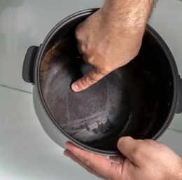 | Se zgodi, da se jed vsled neprisotnosti pri kuhi tisto, kar je v loncu zažge, ker je vode zmanjkalo, ter se hrana zapeče in zogleni. A vseno moraš resnično biti pujs, ki takšno posodo daš v regal. Obstoji možnost izkuhavanja z malo pralnega sredstva, žična goba, ki dela čudeže, specialna brusna goba, Če res nič ne pomaga pa takoj v odpad. In v trgovino po nov lonec! |