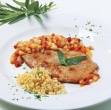Zrezke ponudimo s pripravljeno omako in zelenjavo. Jed okrasimo z žajbljevimi lističi. Kot prilogo postrežemo instantno pšenico ali dušen riž.