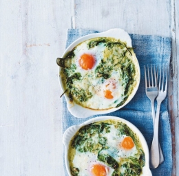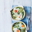 100 g mlade špinače 4 žlice svežega bazilikinega pesta 1 dl sladke smetane sol poper 1 žlica drobno naribanega grojerja ali drugega aromatičnega trdega sira 4 srednje velika jajca
