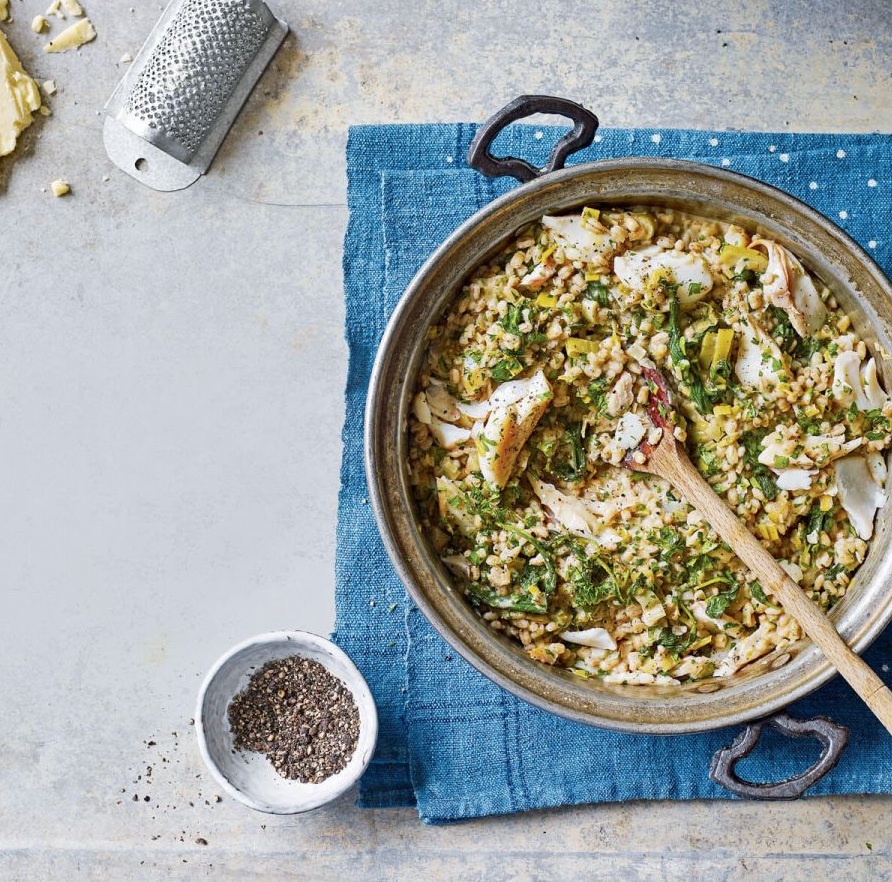8 dl piščančje, ribje ali zelenjavne jušne osnove 400 g dimljene vahnje (lahko tudi postrvi, skuše, brancina ali orade) 30 g masla 1 por sol in poper 250 g ješprenja 1 dl suhega vermuta ali drugega suhega belega vina 100 g mlade špinače 2 žlici drobno sesekljanega peteršilja 3 žlice sladke smetane (po želji) 30 g naribane starane gaude ali edamca za posip (po želji)