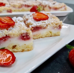 Preko testa prelijemo kremo in posujemo z jagodami. Po vrhu dodamo še jagodno marmelado in potrosimo preostanek testa.