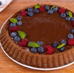 | Ta bogata in svilnata čokoladna pita s kremastim ganache prelivom in svežim jagodičevjem je prava poslastica za vse ljubitelje čokolade.