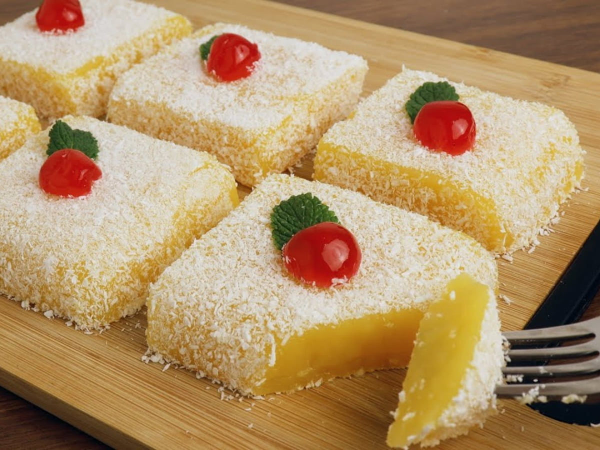 Pripravimo model (pekač), ki ga namastimo in vanj vlijemo kremo. Pustimo, da se ohladi in narežemo na pravokotnike, ki jih povaljamo v kokosovi moki in okrasimo s kandiranim sadjem in listom mete.