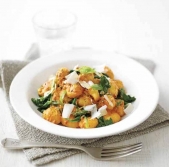 Njoki iz sladkega krompirja s pršutom in šparglji