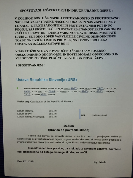 Potem pa se vloži civilno odškodninsko tožbo na fizično ime in priimek ( uradne osebe), po drugem odstavku 26.člena USTAVE RS, v 10x-tni vrednosti kazni, katero so vam protiustavno in protizakonito napisali !!! Delite , drugače vam bodo vse lokale uničili z protiustavnimi on protizakonitimi pct in pc pogoji .....
