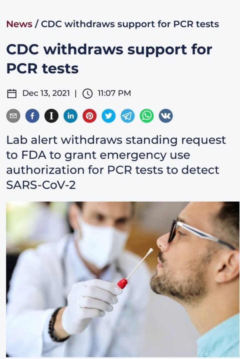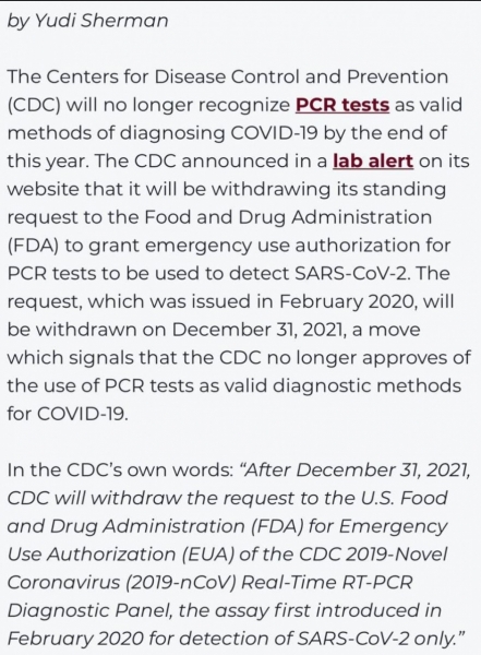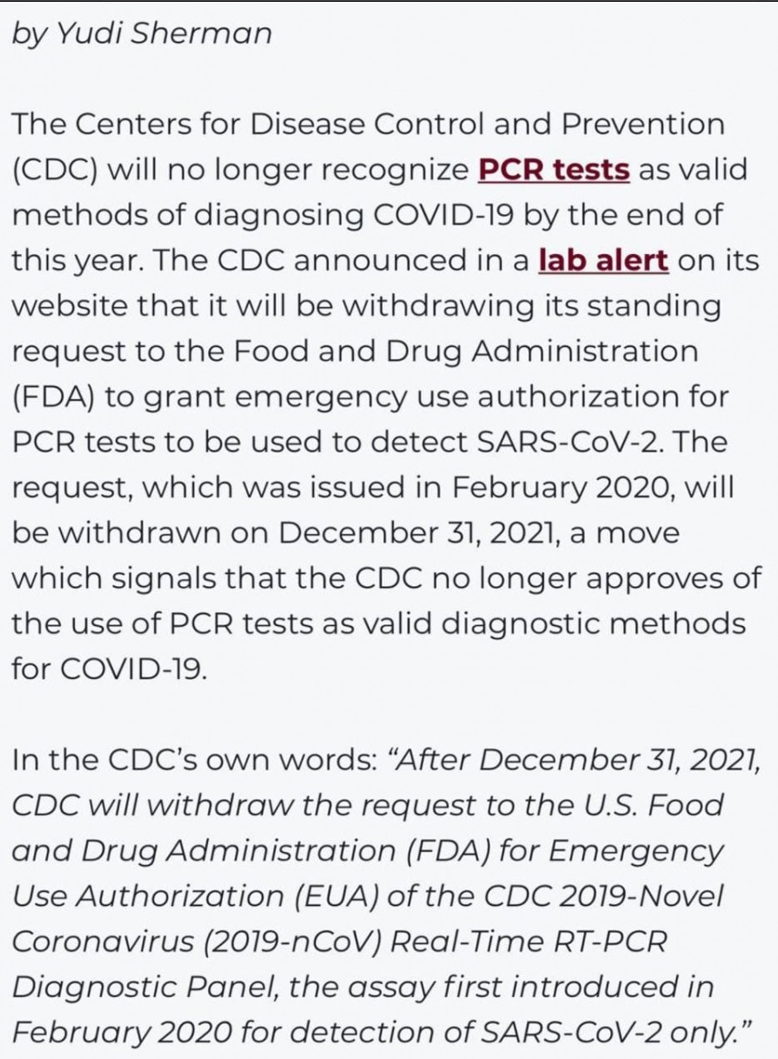 CDC umika svojo trenutno vlogo pri FDA za odobritev testa P.C.R za Kovid. Po 20 mesecih laganja CDC ne more več skrivati dejstva, da je bila njihova uporaba P.C.R testov Kovid lažna "znanost" in namerna taktika prestraševanja z genocidnimi posledicami.