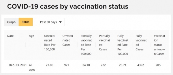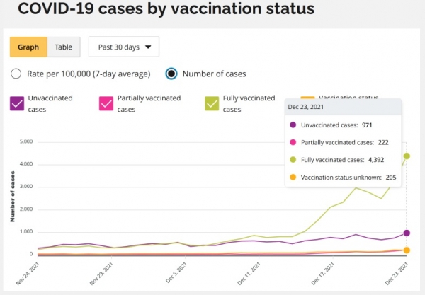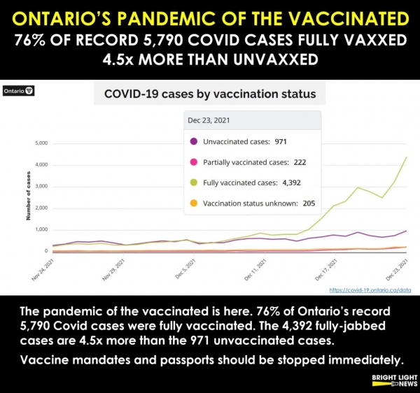 Zadnji podatki v Ontariu z dne 23. decembra 2021 so pokazali spektakularno stopnjo neuspeha, saj je bilo 76% od vseh 5.790 primerov covida (nov rekord) v celoti cepljenih. 4.392 primerov dvojnega vboda predstavlja 4,5-krat več primerov kot necepljenih.