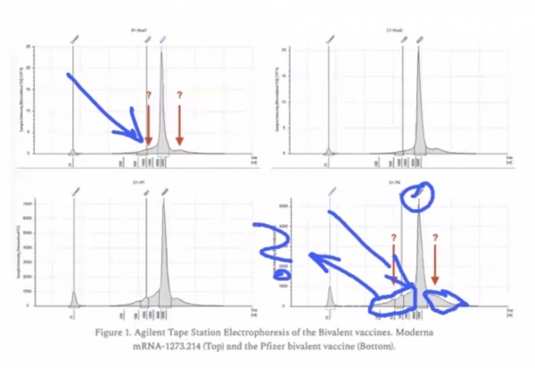 Vendar pa so analize cepiva pokazale, da vsa vsebnost mRNA nikakor ne ustreza celovitosti, ki bi jo dejansko pričakovali. Označeni deli vsebine označujejo »neke« delčke mRNA, za katere nihče ne ve, kaj vsebujejo in čemu služijo. Kljub temu se tudi vbrizgajo, zapišejo v človeške celice – s povsem nejasnimi posledicami. Ker pa je rak razbohotil povsod po svetu, je mogoče vsaj domnevati, kakšne posledice si je med drugim mogoče zamisliti pri nas.
