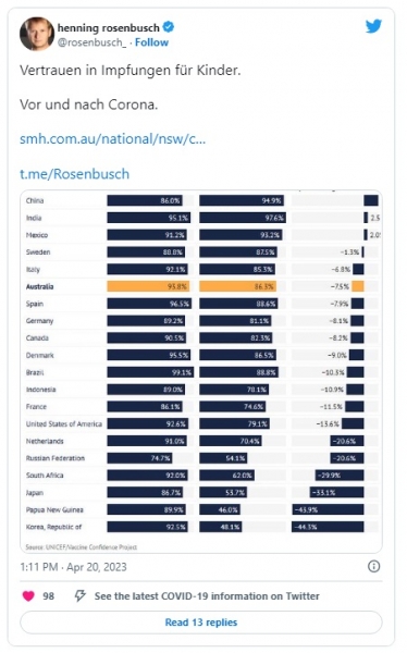Predvsem na Nizozemskem, v Rusiji, Južni Afriki, na Japonskem, v Papui Novi Gvineji in Južni Koreji je nezaupanje močno naraslo: v Južni Koreji je pred covidom-19 cepljenje otrok menilo 92,5 odstotka državljanov - zdaj je le še 48,1 odstotka. . .
