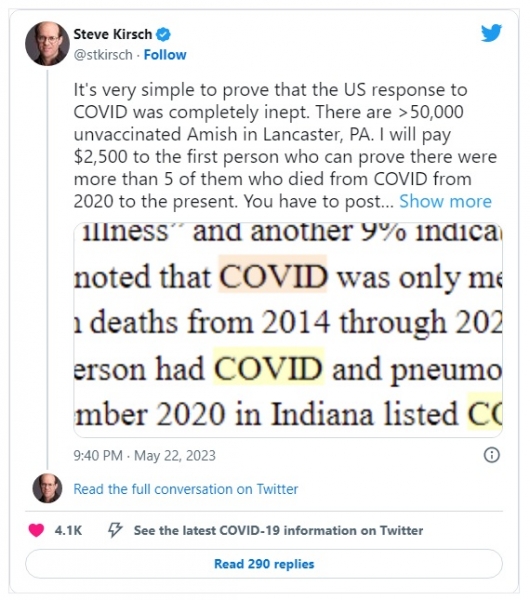 Da poudarimo, Steve Kirsch ponuja 2500 $ prvi osebi, ki lahko najde več kot peščico necepljenih Amišev, ki so umrli zaradi COVID-a v Lancastru v Pensilvaniji med pandemijo.