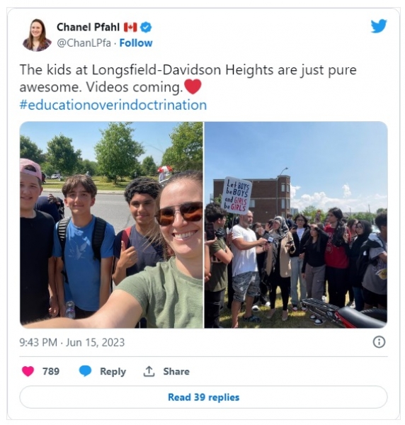 Chanel Pfahl, nekdanja srednješolska učiteljica, ki govori proti radikalni ideologiji spolov, ki se poučuje mladim študentom, je na družbenih omrežjih zapisala: "Otroci v Longfields-Davidson Heights so preprosto neverjetni."