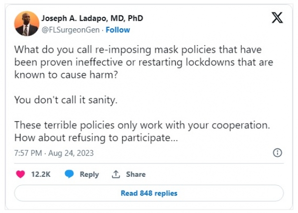 »Kako imenujete ponovno uvedbo politik mask, ki so se izkazale za neučinkovite, ali ponovno uvedbo zapor, za katere je znano, da povzročajo škodo?« je dejal Ladapo v objavi na Twitterju/X.