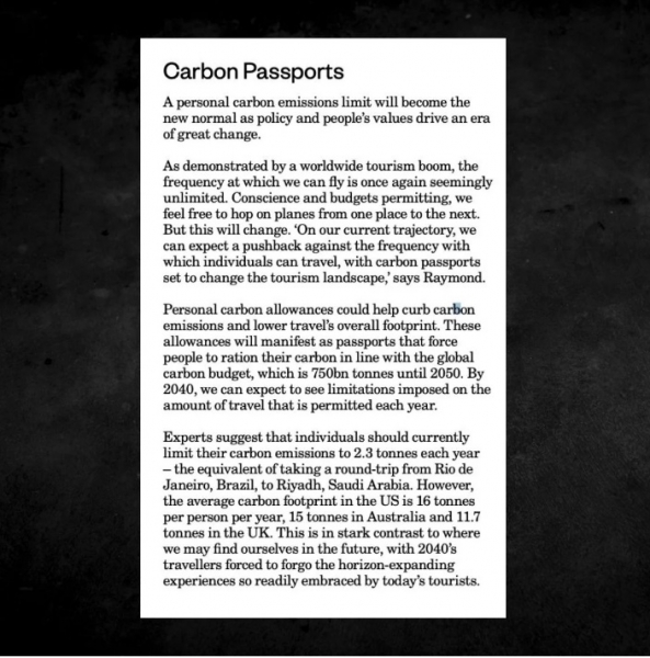 Poročilo, ki te omejitve imenuje "osebna dovoljenja za ogljik", napoveduje, da bodo služile kot merila, ki bodo posameznike prisilila, da se prilagodijo globalnemu proračunu ogljika.