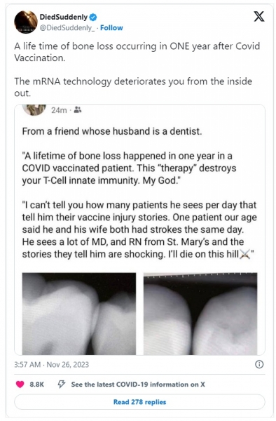 Huda izguba kosti se zgodi le leto dni po cepivu proti COVID-u, ker mRNA razjeda kost, poročajo zdravniki: