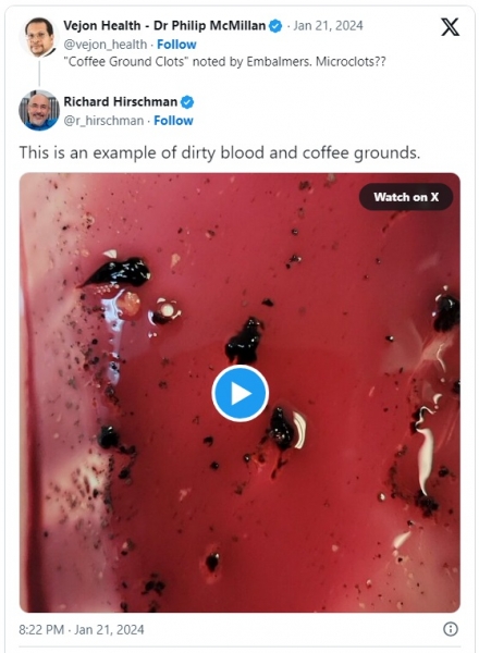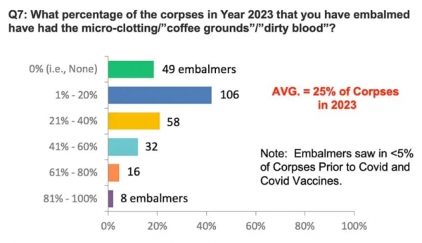 Skoraj 80 % anketirancev je poročalo, da ima povprečno 25 % trupel mikrostrdke, kar dokazuje "kavni usedlini" podoben material v krvnem obtoku. Nekateri balzamirji so videli te strdke v veliko večjem odstotku trupel.