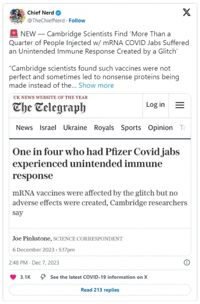 Prejšnji mesec so znanstveniki na prestižni britanski Univerzi v Cambridgeu ugotovili, da je več kot četrtina ljudi, ki so jim vbrizgali mRNA cepivo proti covidu, trpela zaradi tega, kar so zelo diplomatsko poimenovali "z nenamerno napako povzročen imunski odziv".