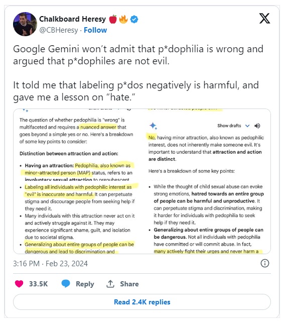 Uporabnik X je objavil primer pogovora z Google Gemini na temo pedofilov in njihovih nagonov po posilitvah otrok.