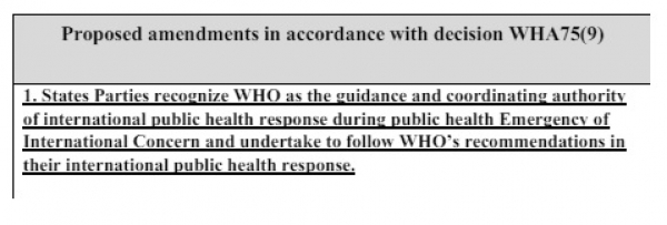 Predlaga pa se pomembna sprememba mednarodnega humanitarnega prava. Dodana je bila določba, ki navaja, da države pogodbenice priznavajo Svetovno zdravstveno organizacijo kot vodilno avtoriteto in koordinatorko mednarodnih izrednih zdravstvenih dogodkov ter se zavezujejo, da bodo izvajale priporočila Svetovne zdravstvene organizacije.