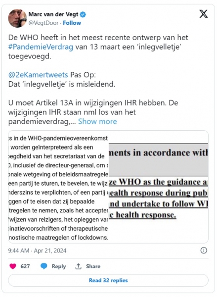 To je člen 13a revidiranih mednarodnih zdravstvenih predpisov (IHR). Spremembe IGV so neodvisne od sporazuma o pandemiji; gre za dva vzporedna reformna procesa, pojasnjuje Van der Vegt.