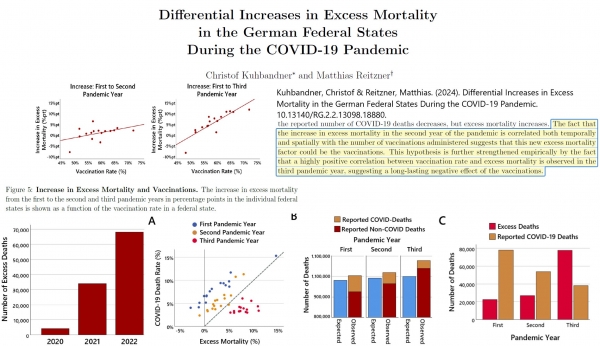 »Glede naraščanja presežne umrljivosti je opaziti vedno močnejšo pozitivno korelacijo s precepljenostjo zvezne dežele, ki v tretjem pandemičnem letu dosega vrednost r = 0,85, kar kaže, da je presežna umrljivost rasla, ko je bila precepljenost višja v zvezna država. Analiza mrtvorojenosti je pokazala popolnoma enak vzorec," navaja študija v razdelku "Rezultati".