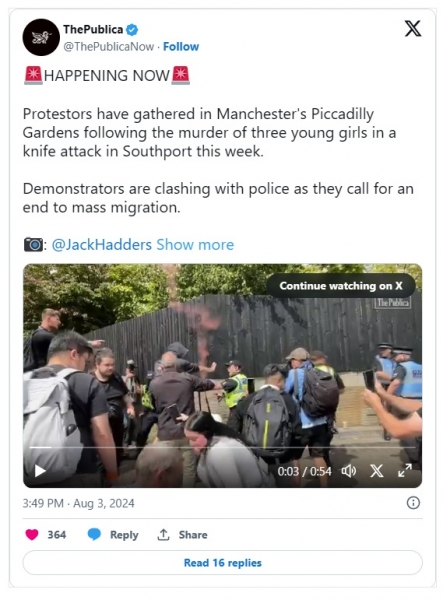 V Manchestru je izbruhnil prepir med levičarskimi in desničarskimi protestniki, pri čemer so desničarji metali ograje in druge odpadke na policiste, ki so poskušali ločiti skupine.