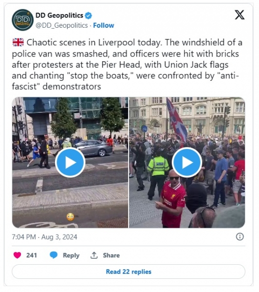 Več kot 30 protestov je potekalo v soboto v mestih, vključno z Liverpoolom, Nottinghamom, Leedsom, Belfastom, Stoke-on-Trentom, Blackpoolom in Hullom. Do demonstracij je prišlo skoraj teden dni po nemirih, ki so izbruhnili v mestu Southport, potem ko je Axel Rudakuban, 17-letnik, rojen v Veliki Britaniji staršem iz Ruande, ubil tri otroke in ranil deset drugih.
