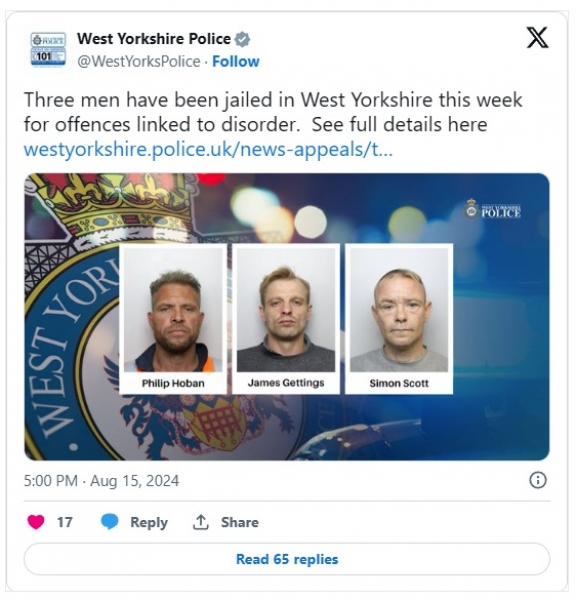 Medtem je sodišče v Leedsu prav tako obsodilo 49-letnega Simona Scotta na 10 tednov zapora zaradi "objave objave na družbenih medijih, ki je bila skrajno žaljiva". Vsebina sporočila ni bila javno objavljena.