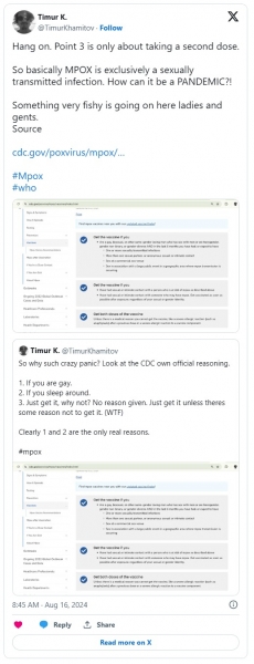 V Kanadi (glej tvit zgoraj) ljudje že izvajajo preizkušeno propagando cepljenja. V Torontu so v prvi polovici leta 2024 zabeležili 93 primerov opičjih koz, "70 odstotkov pa ni bilo popolnoma cepljenih." Nasprotno pa to tudi pomeni, da je 30 odstotkov primerov prejelo vsaj dva odmerka cepiva – in kljub temu zbolelo. Nekaj podobnega poznamo že iz koronskih časov...