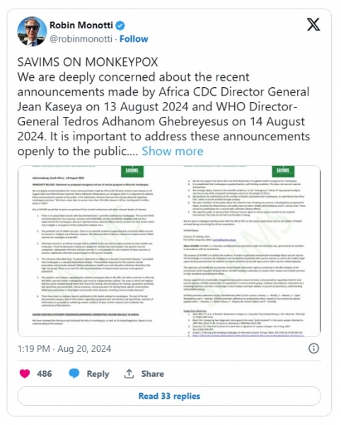 Južnoafriška organizacija, ki zastopa žrtve cepiv, je posvarila pred široko uporabo cepiva Mpox, ki ga glede na podatke in okoliščine opisuje kot "eksperimentalno". Južnoafriška medicinsko-pravna študijska skupina za poškodbe zaradi cepiv (SAVIMS) je izrazila zaskrbljenost glede varnosti in učinkovitosti cepiva, ki se bo uporabljalo za boj proti trenutnemu izbruhu Mpox v Afriki.