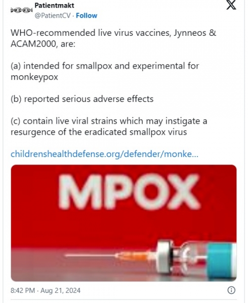 SAVIS ob sklicevanju na potrjene podatke trdi, da cepiva Mpox niso ustrezno testirana in da morebitni stranski učinki niso znani. Razvili so jih tudi za drugačen sev ošpic. Poleg tega bi uporabili »žive« viruse črnih koz, kar poveča verjetnost izbruha pravih črnih koz. Organizacija poziva k nadaljnjim študijam in skrbni oceni tveganj in koristi, preden se cepiva začnejo uporabljati v velikem obsegu.