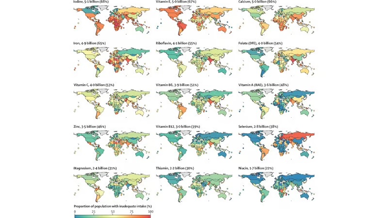 „Na podlagi ocen vnosa hranil s hrano (brez obogatitve in dodatkov) več kot 5 milijard ljudi ne zaužije dovolj joda (68 % svetovnega prebivalstva), vitamina E (67 %) in kalcija (66 %). Več kot 4 milijarde ljudi ne zaužije dovolj železa (65 %), riboflavina (55 %), folne kisline (54 %) in vitamina C (53 %). V isti državi in starostnih skupinah je bil ocenjen neustrezen vnos joda, vitamina B12, železa in selena pri ženskah večji kot pri moških, magnezija, vitamina B6, cinka, vitamina A, tiamina in vitamina A pri moških pa večji kot pri ženskah. niacin,« pravi študija v razdelku »Ugotovitve« povzetka.